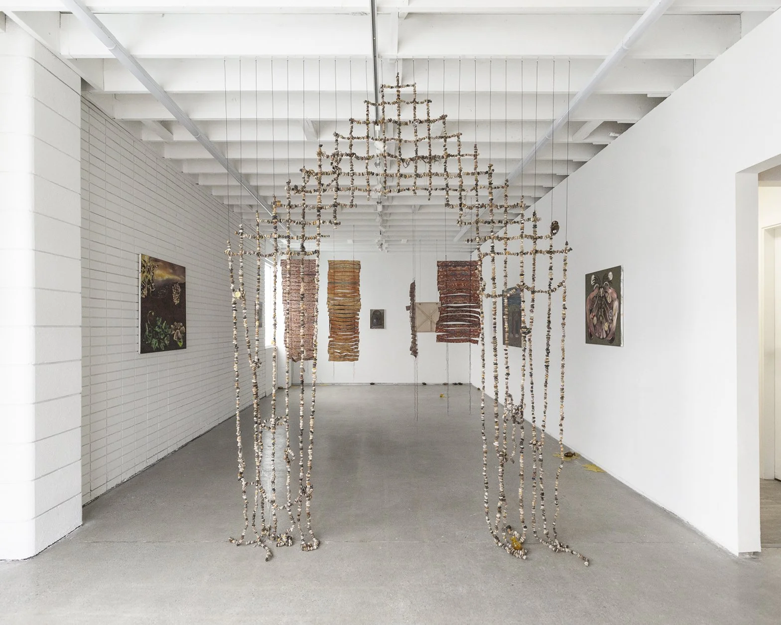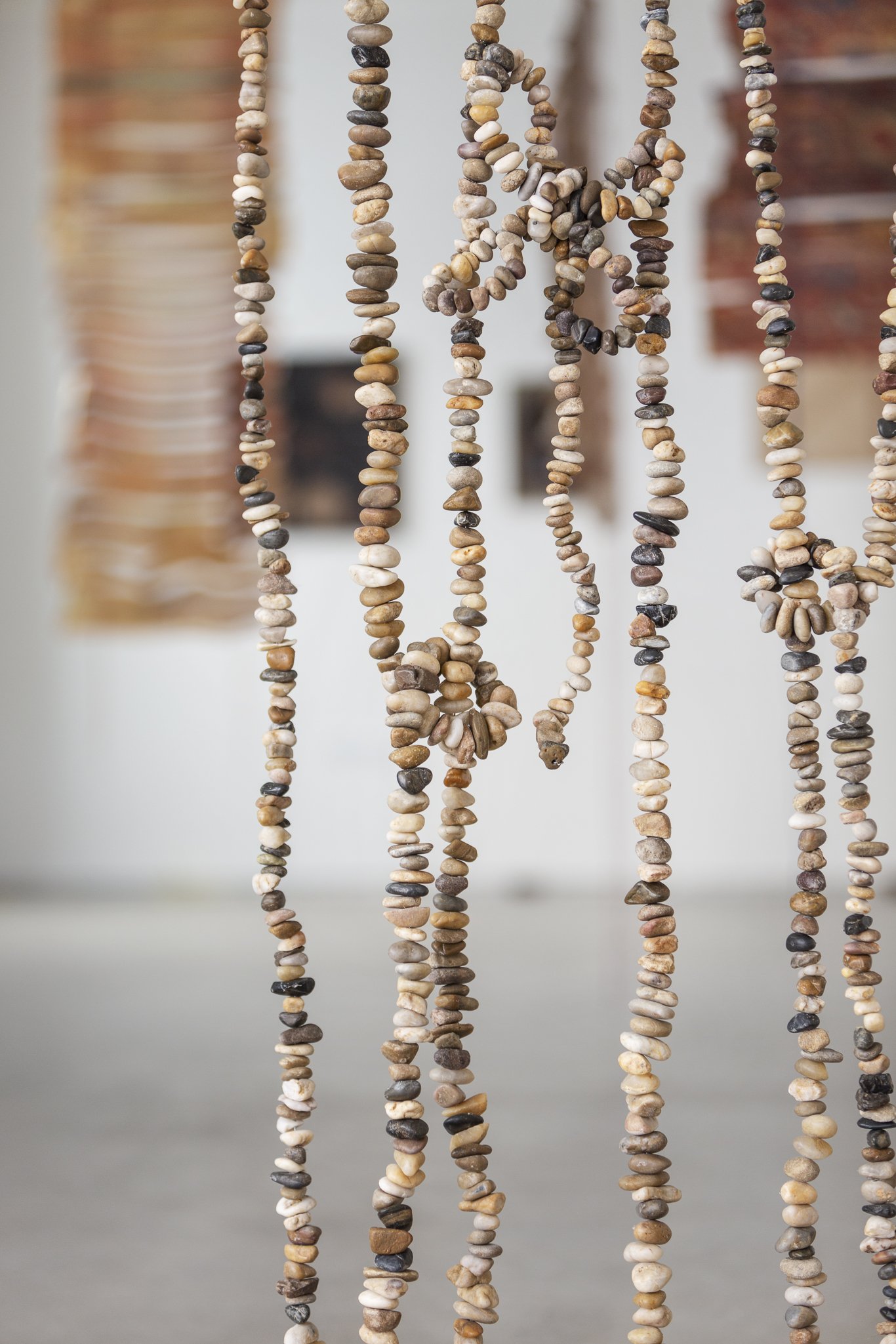 Garden-Smith extends this project of refusal, reversal, and voiding to the hidden politics of our living spaces, and, by extension, the background conditions of everyday life and its economic underpinnings. Taking décor as her point of entry, Garden-Smith exerts stress on interstitial bits of architecture—its thresholds and margins—and places accents on our habitual experiences of these interstices. Staged as an architectural intervention, Garden-Smith’s arched, threaded rock façade and eccentric window blind sculptures mirror, double, reflect, and reverse the walls, arches, and edifices in Boulos’s paintings. In their precarious dramatization of controlled spaces, they also amplify the paintings’ sense of fugitivity.